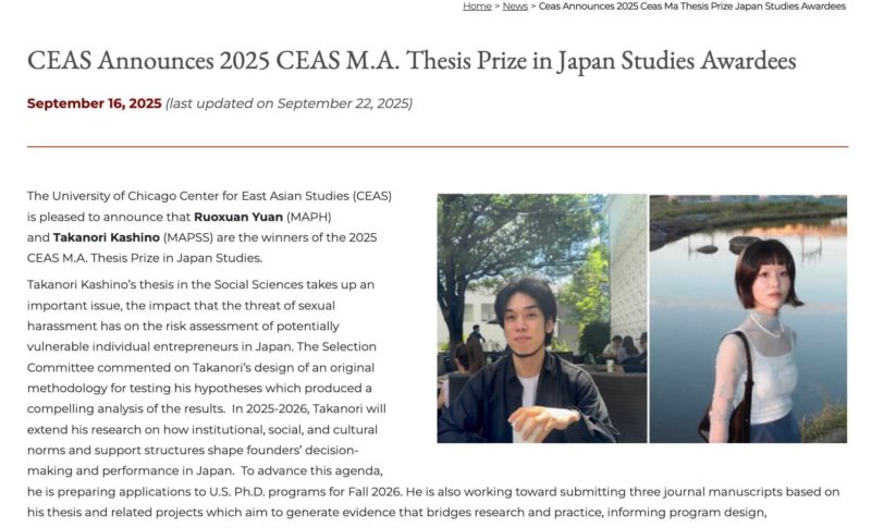 芦澤研究室の特任助教 柏野尊徳さんが、米シカゴ大学 Center for East Asian Studies選定の「日本研究 最優秀修士論文賞(CEAS M.A. Thesis Prize in Japan Studies)」を受賞しました。⇒詳細はこちら